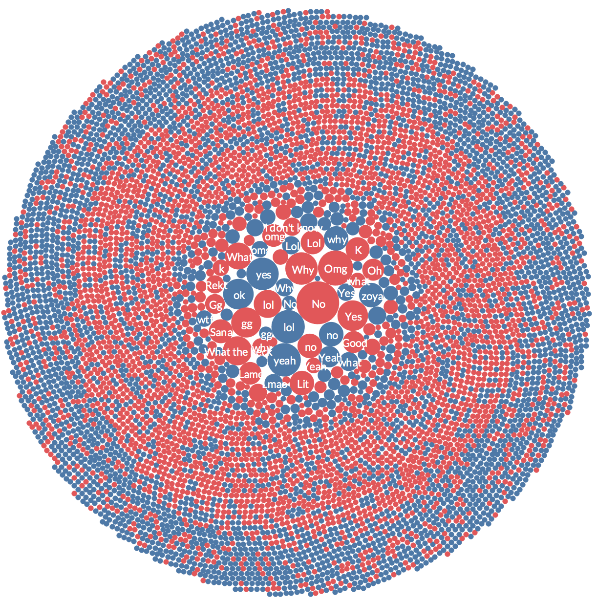Using the same concept of visualizing the most frequently sent messages, I iterated a data sketch as a clustered bubble chart. The different colours show who sent the message.