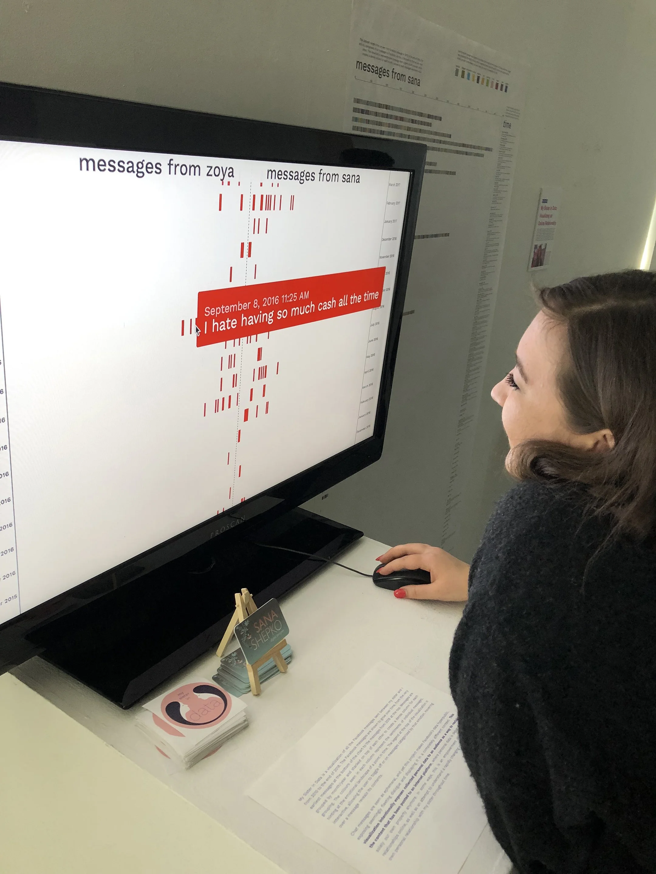 For the Digital Futures graduate thesis exhibition, I ran the data visualization website off a local server on my computer and connected it to a large monitor. I felt it would be important to be able to see the visualization all at once rather than to be limited to scrolling through it on the screen, so I created two large posters, split into messages from Zoya and messages from me, that showed the entire span of messages over time. These posters included guiding annotations above each axes and above the sentiment legend to help lead a viewer through understanding how to read the chart. Each time frame in the time axes had an annotation, summarizing the big events of that time and what the gist of the message data at that time was about. This allowed the project to be more contextualized in the lived experiences of Zoya and I rather than an abstract visualization.